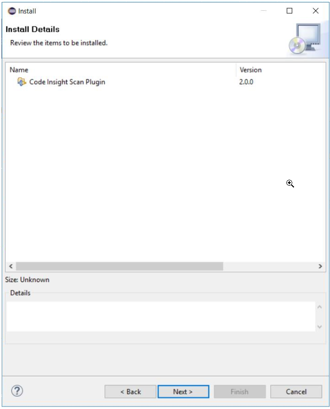 Click the checkbox next to the Code Insight Scan Plugin entry, and click Next. The Install Details window is displayed, listing the plugin you are preparing to install.