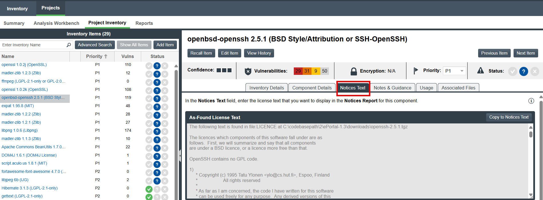 1. In the Notices Text tab for the inventory item, click the Copy to Notices Text button in the top right corner of the As-Found License Text field.